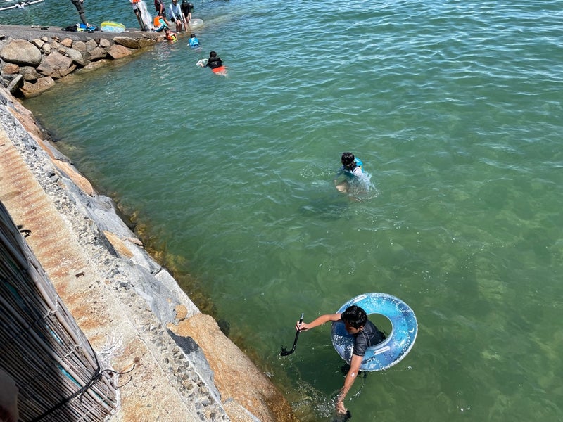 腹一杯お肉を食べたら、元気に泳ぐ子供達
