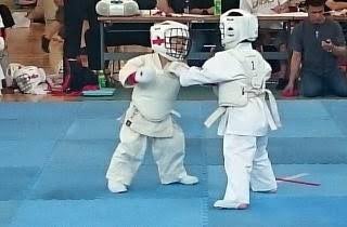 試合開始と同時に「とりゃーーー!!」と凄まじい気合いとともに上段前蹴りで技ありをとる幼年の子がいた。